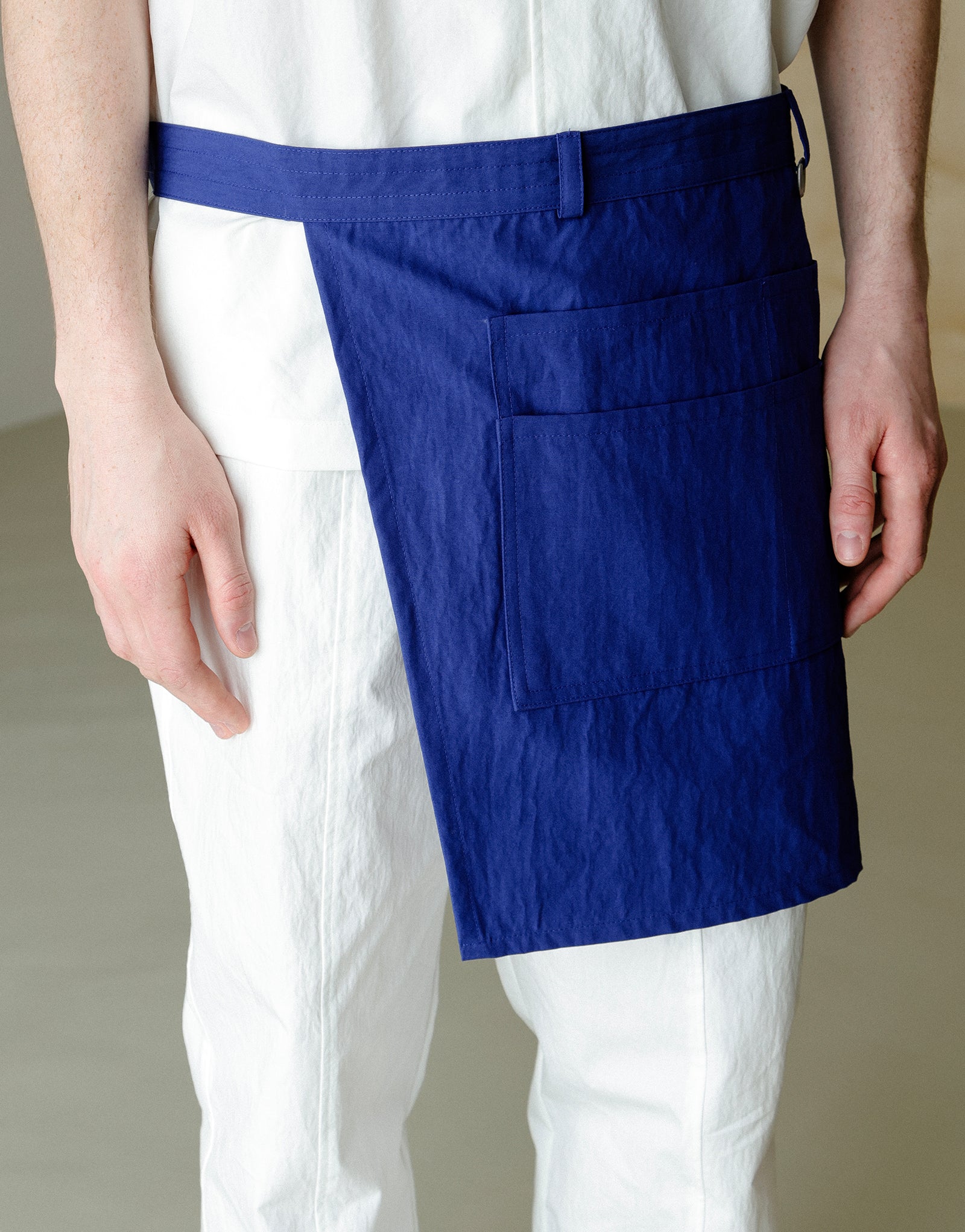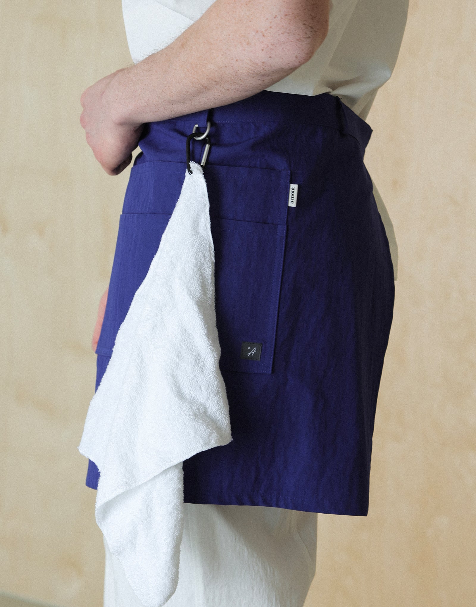 Le bouton-pression réalisé en l'enveloppant dans un tissu de vêtement de chef donne un sentiment d'unité et il est pratique à mettre et à enlever.