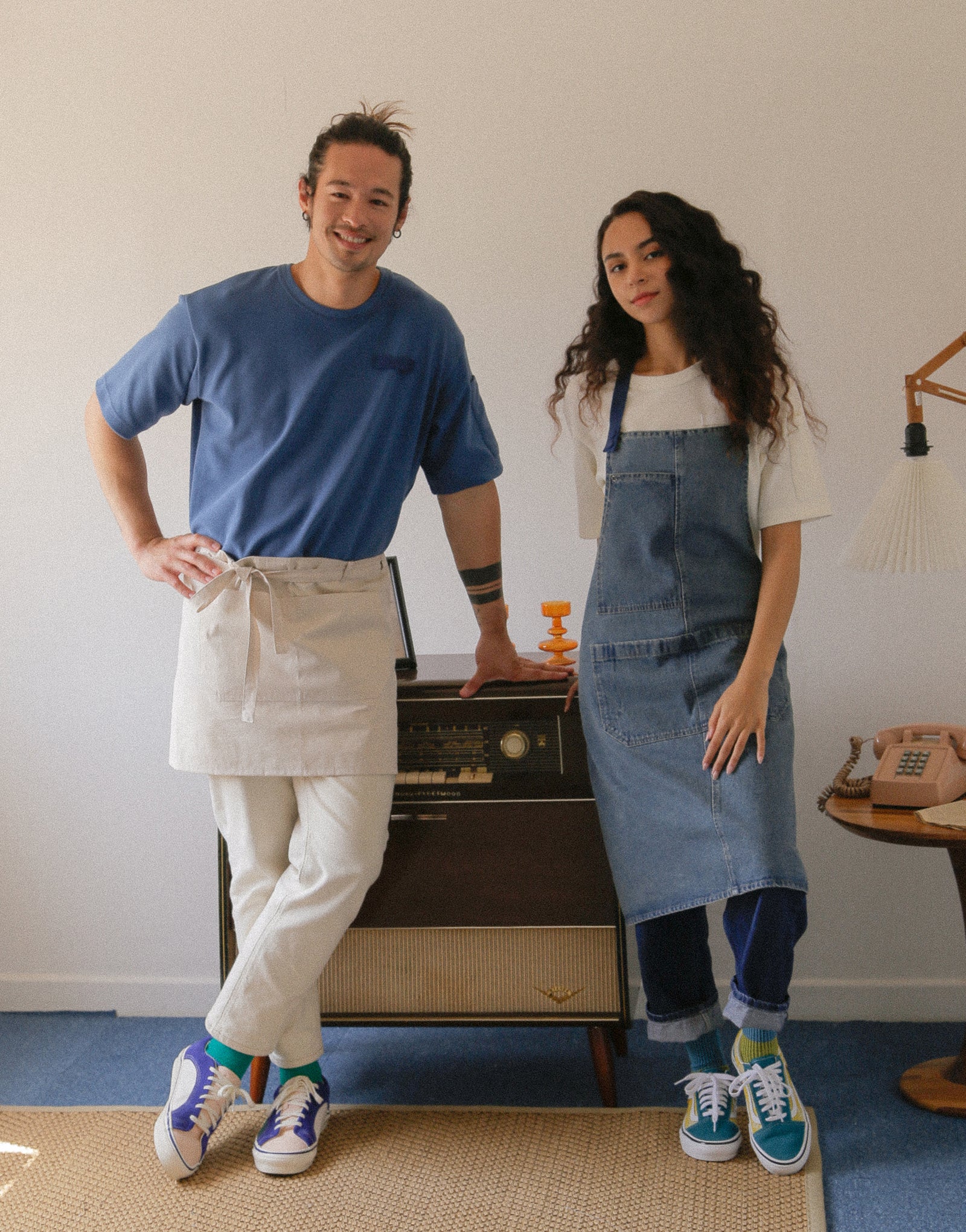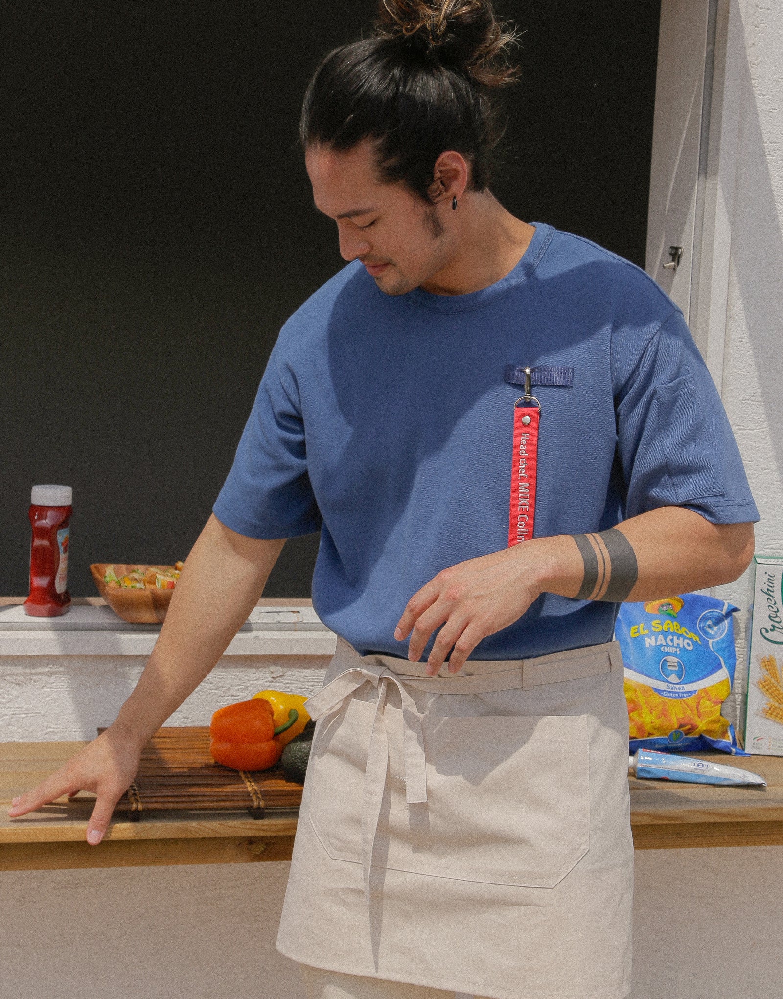 Le bouton-pression réalisé en l'enveloppant dans un tissu de vêtement de chef donne un sentiment d'unité et il est pratique à mettre et à enlever.